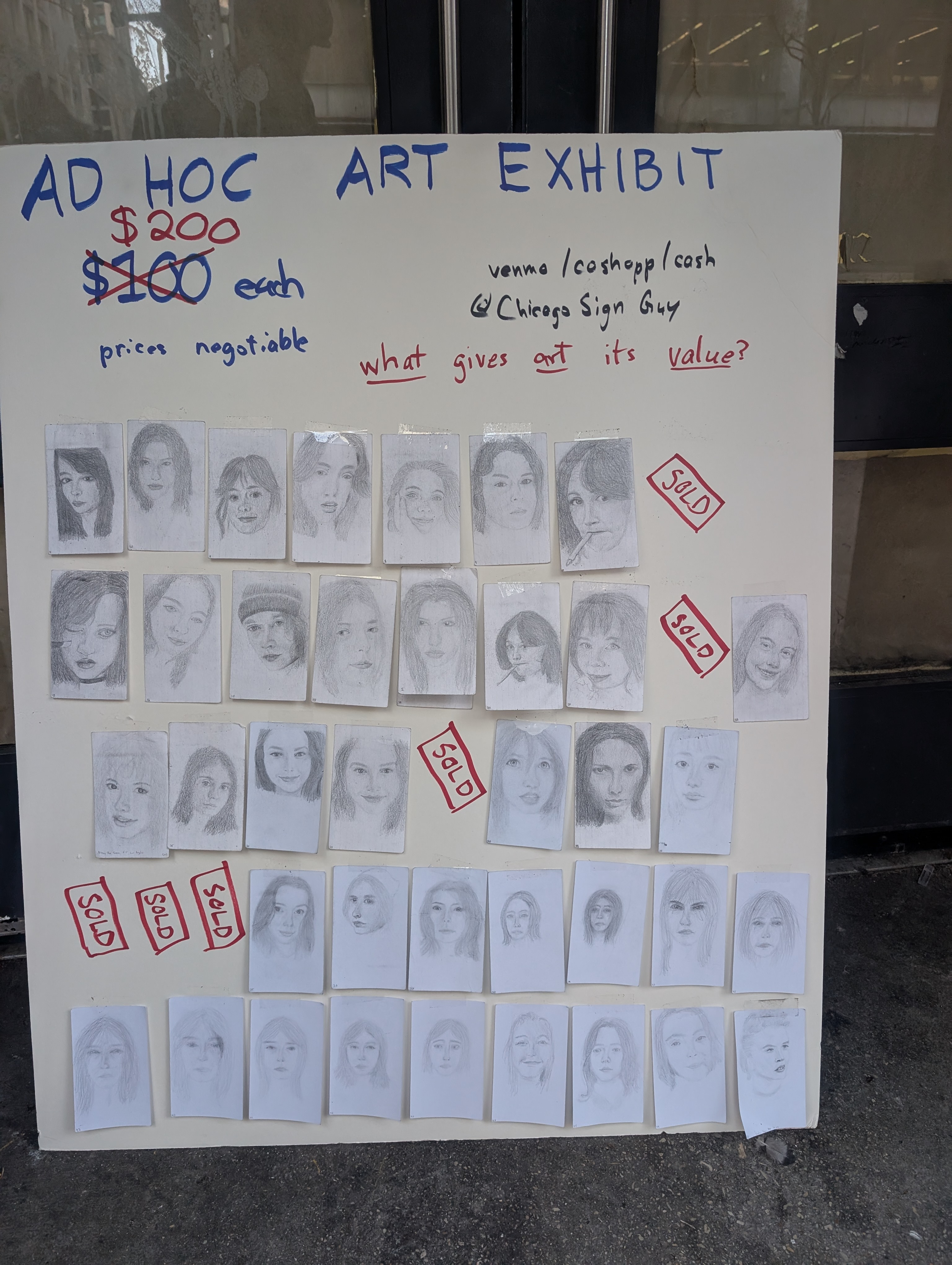 So, today, I had the idea to tape my 50 sketches to a poster, as an ad hoc art exhibit, and charge $100, no, $200 per sketch. Prices, of course, were negotiable.