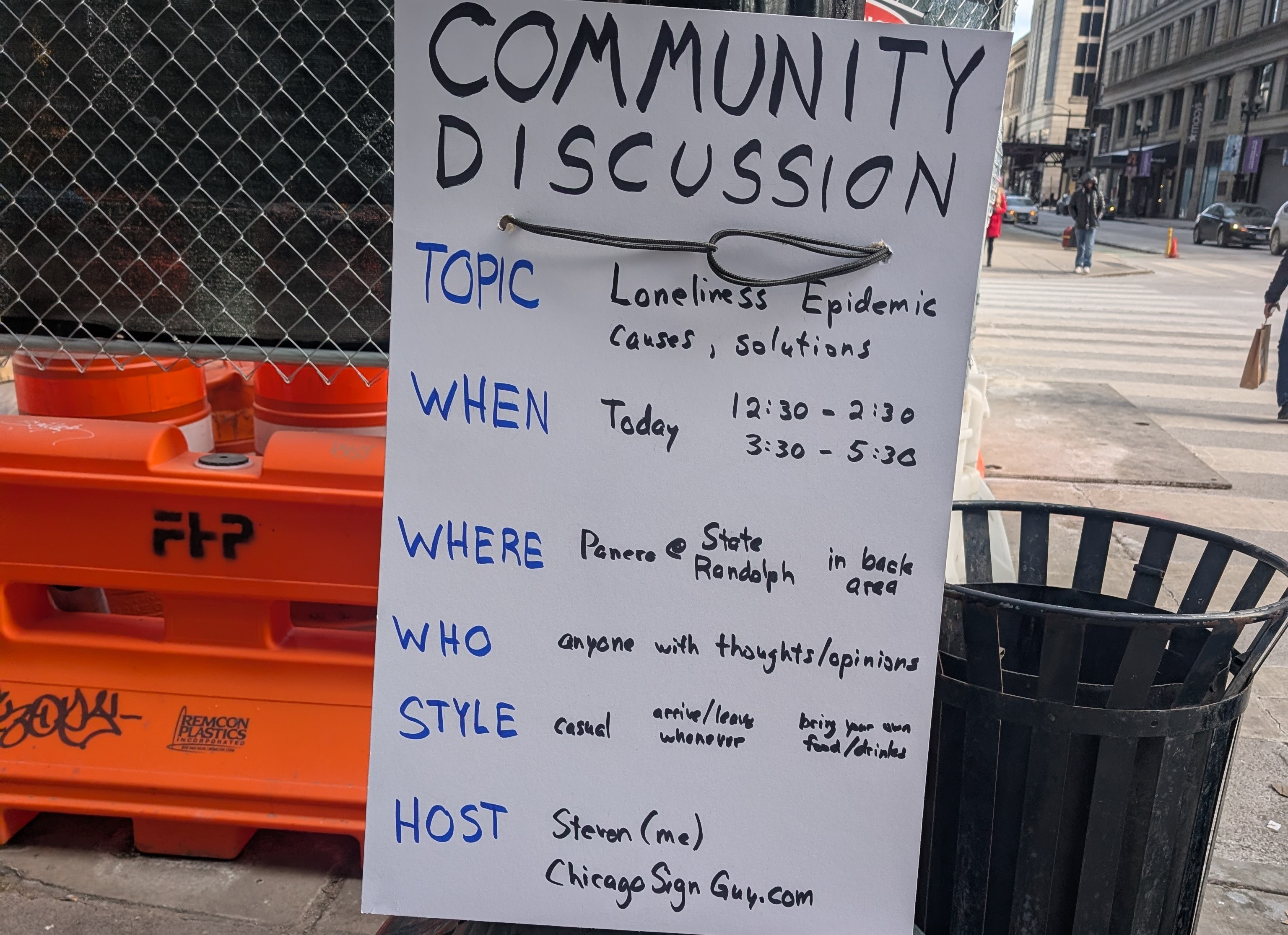 So that gave me an idea. I've been wanting to do a social experiment, where I hold up a sign inviting people to a group discussion at a specific time on a specific topic. Why not do it with this one?
