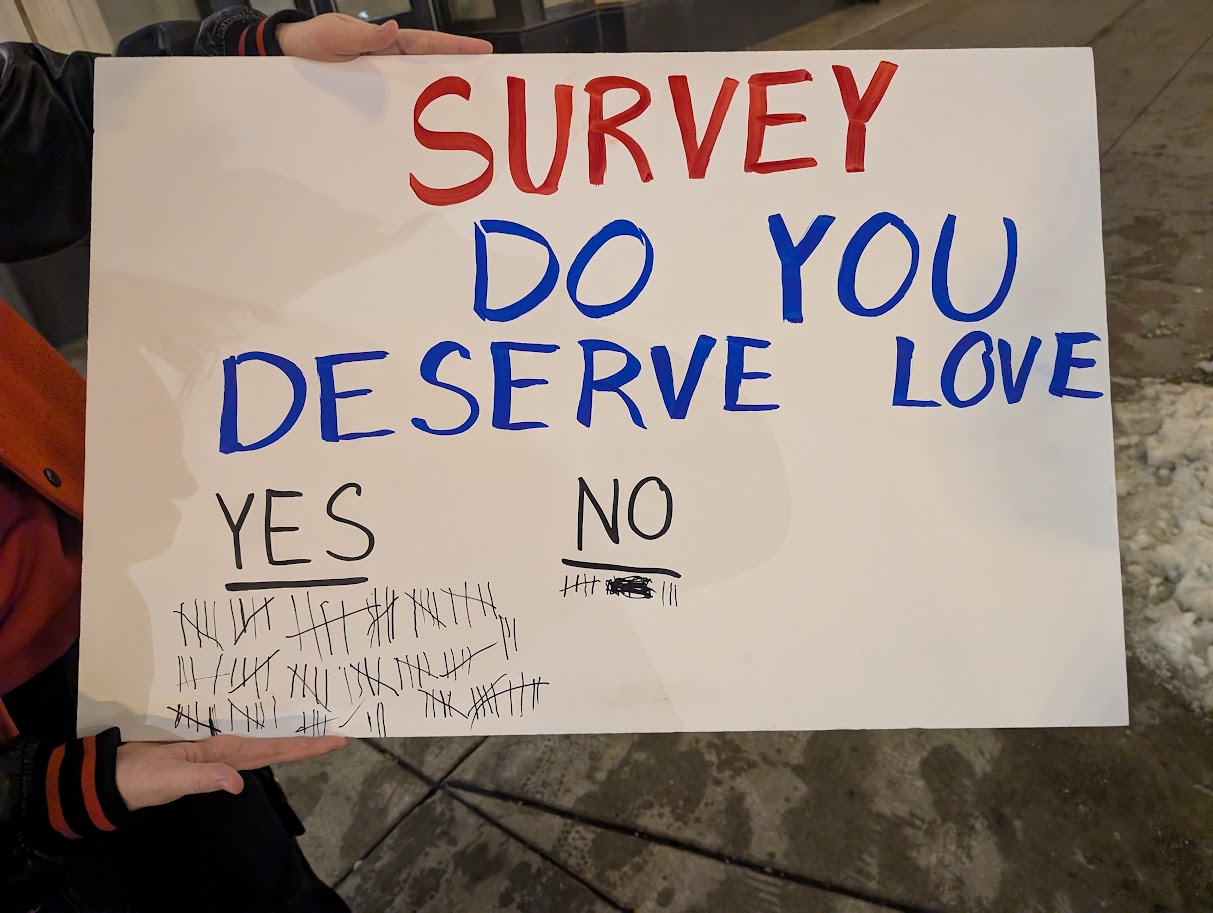 The results are in from last Sunday's survey! The verdict, most people believe they do deserve love, a few don't, but only kinda sorta. At least, most people who took the survey. I wonder how many people saw the sign and thought "no" but didn't want to participate for whatever reason.