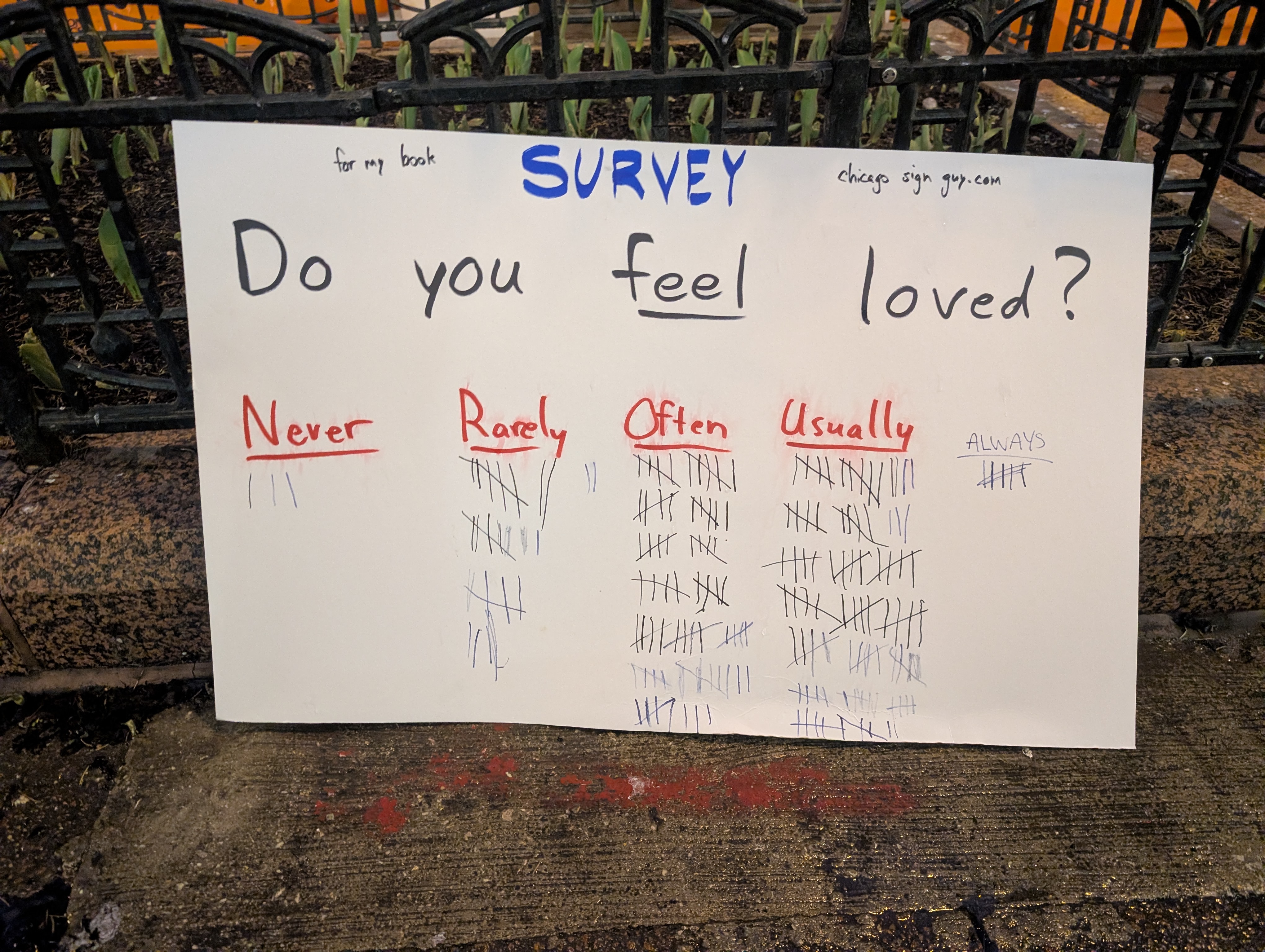 Very early on someone asked why there wasn’t an always category, I said I don’t think it’s true for anyone that they feel loved 24/7/365. He said he would have put always if it was there. About 5 or 7 people said they would put always if it was there and put Usually since it wasn’t. Around 5pm or so, someone I’ve talked with a few times came and did the survey and asked if she could put always, and I said I wouldn’t stop her. After her a few people added theirs to it.