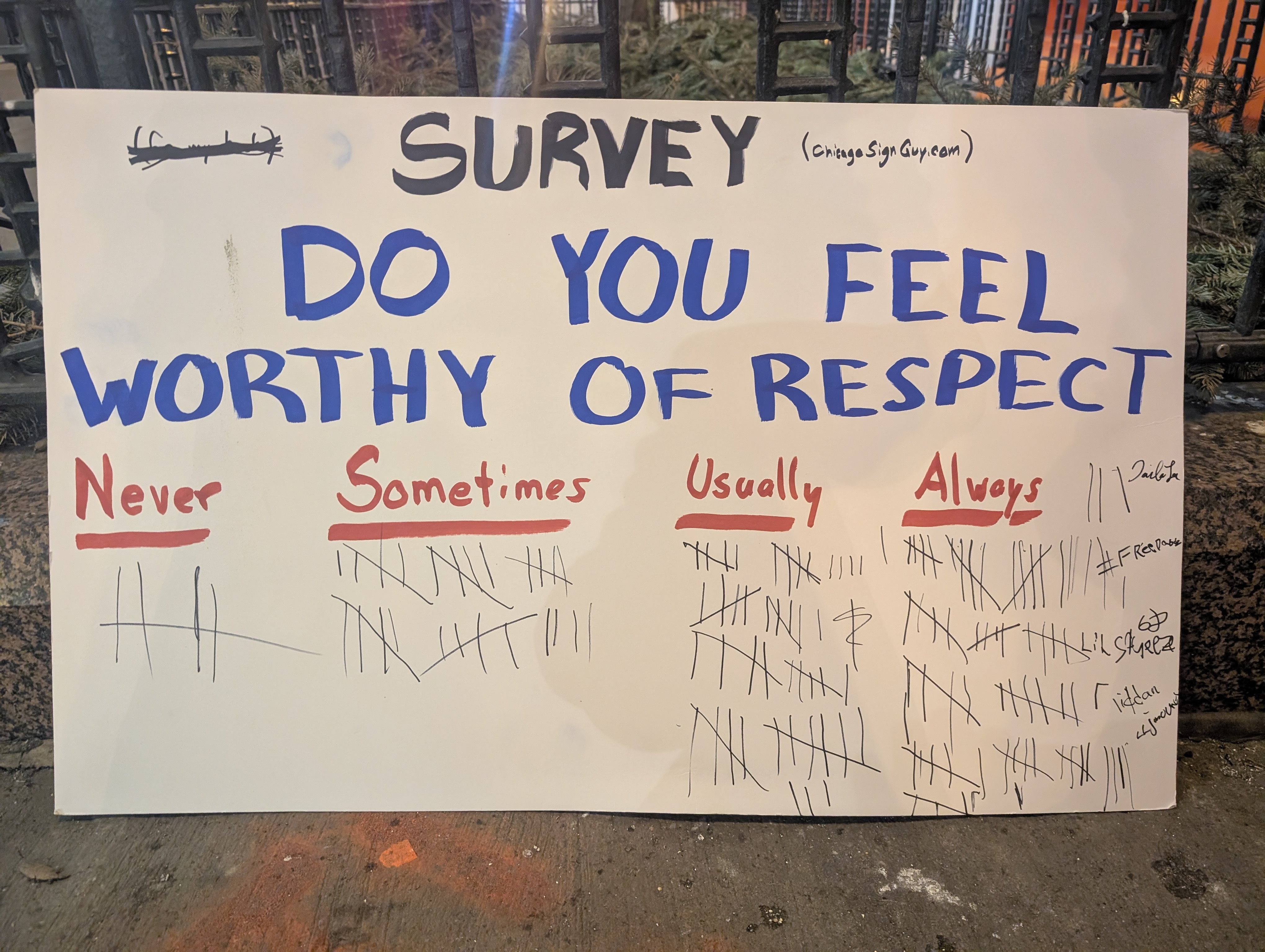 Two homeless men approached me and took my survey and put Always. This also made my day. I told a friend of mine that I valued their respect toward me more than anyone else's respect and that I didn't know why this was the case. But it's true. One of them (or both? I don't remember) said that you have to earn respect.
