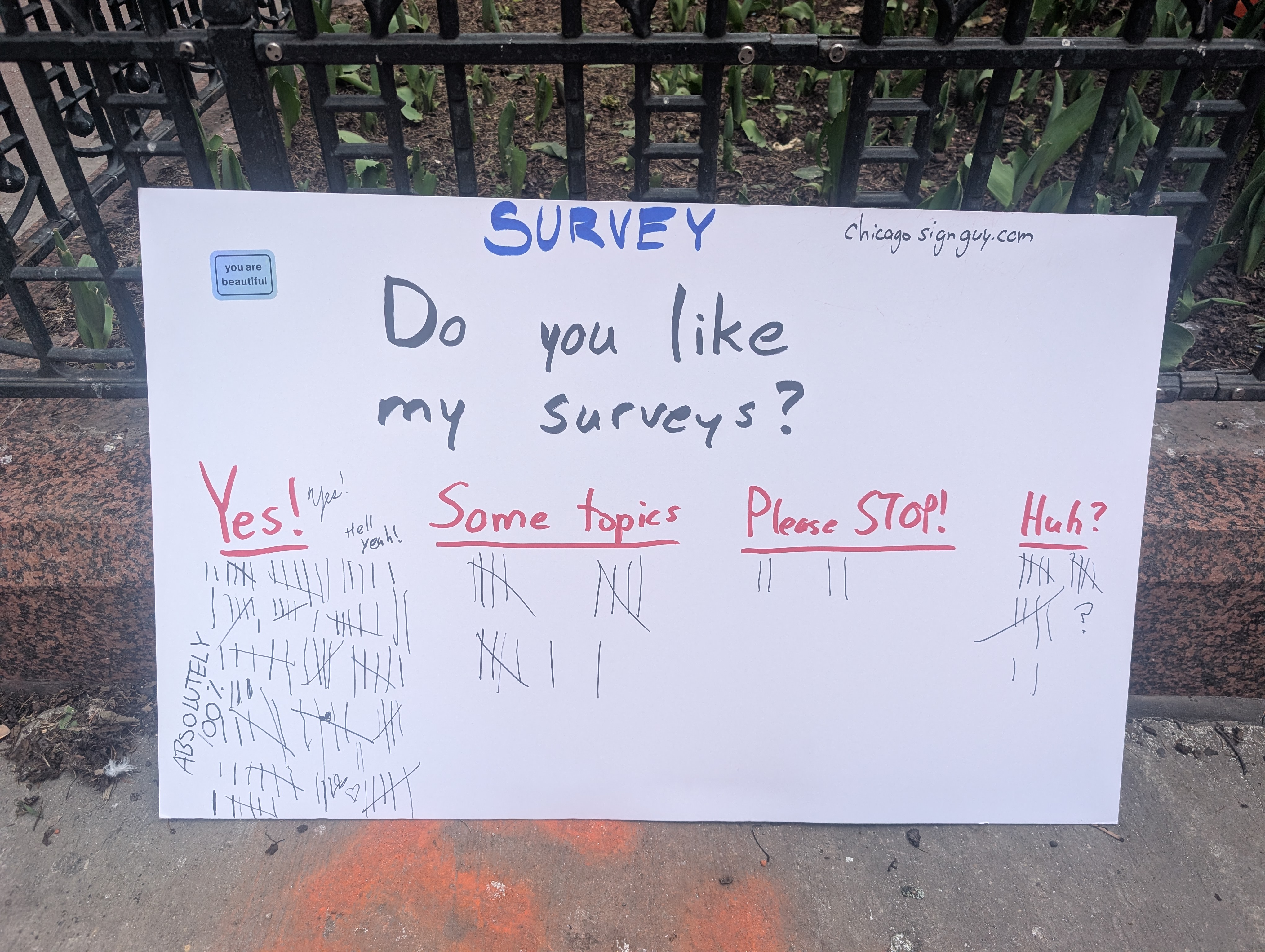 So I went with the idea I had a couple times earlier today, which was to gauge how people feel about my signs, to take a pulse.