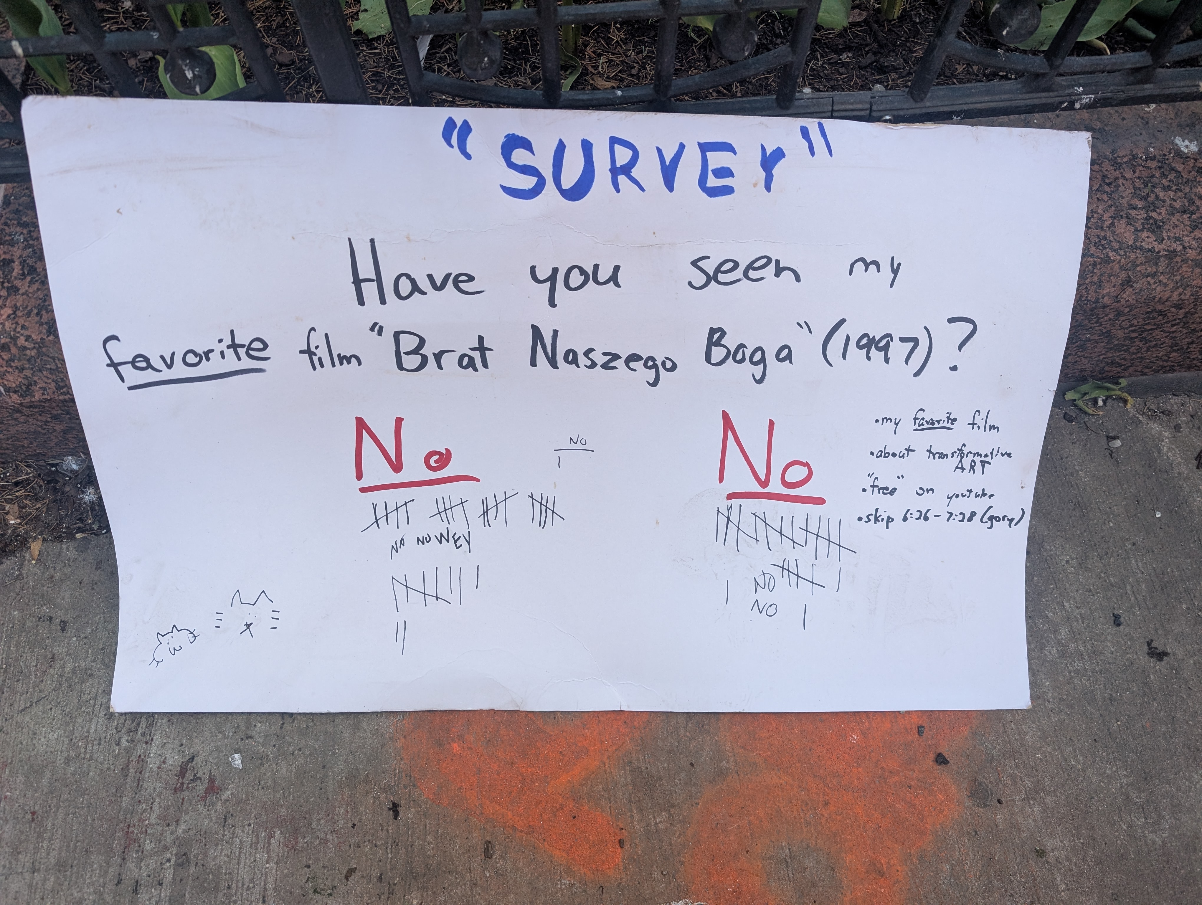 Blick was closed, so I almost didn’t do a survey today. But I found one of my old surveys, by the cardboards! It was the “do you feel loved?” survey, so I took it to St. Peter’s and got a few answers there. Someone coming out of Mass recognized me from my State St surveys! That was cool.